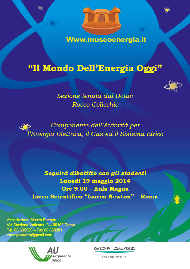 Lunedì 19 maggio presso l'Aula Magna del Liceo Scientifico "Isacco Newton" di Roma il Dottor Rocco Colicchio - Componente dell’Autorità per l’Energia Elettrica, il Gas ed il Sistema Idrico terrà una lezione/dibattito sul mondo dell'energia oggi