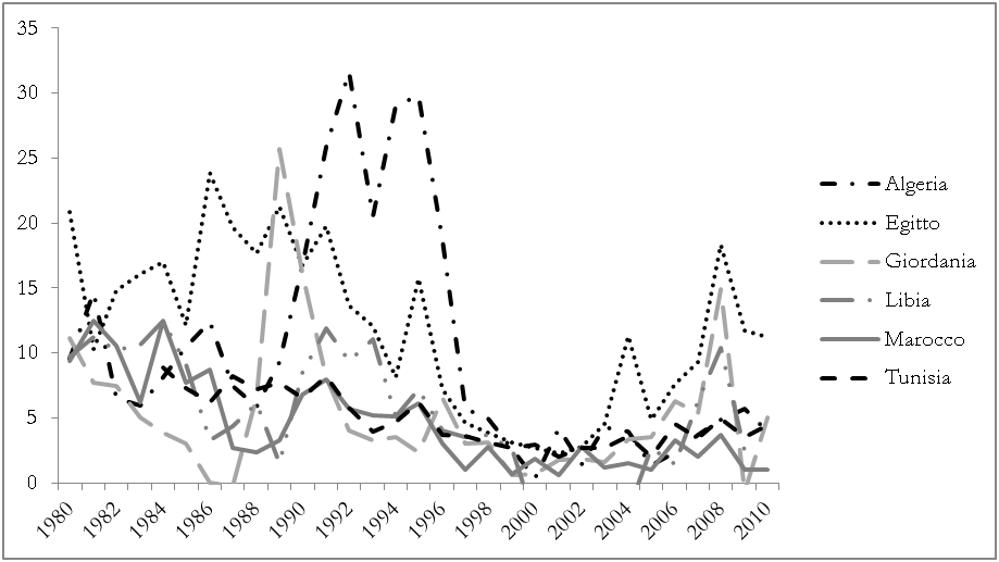 Se si guarda l’andamento dell’inflazione nei paesi in questione, gli ultimi anni non presentano picchi particolarmente elevati rispetto ad anni precedenti. La fig. 1 mostra che dal 2006 l’inflazione relativa ai beni di consumo in Algeria, Egitto, Giordania, Libia, Marocco e Tunisia è si aumentata di molto ma questi aumenti non sono un fenomeno isolato. Se si va indietro nel tempo si nota che i tassi di inflazione, per es. negli anni 80, sono ancora più alti. In Algeria, per es., l’inflazione oscilla tra il 20 e il 30% negli anni dal 1990 al 1997, mentre dal 2007 al 2009 oscilla tra il 2 e il 7%. In Egitto, poi, l’inflazione sale dal 5 al 20% dal 2005 al 2009, livelli di inflazione, questi, già registrati negli anni 80 e 90. Se questo è vero, e visto che l’inflazione negli ultimi anni non è stata particolarmente elevata, c’è da chiedersi se sia ancora valido argomentare che l’inflazione è stata causa dei recenti moti. La risposta ancora una volta è si. Infatti in economia l’impatto delle variabili monetarie – per esempio l’inflazione – sulle variabili reali – per esempio la disoccupazione e la produzione – dipende da quanto “attese” sono tali variazioni. Quindi per es. un aumento atteso dell’inflazione del 10% può avere effetti reali, cioè influenzare le scelte delle imprese e dei consumatori, meno di un aumento inatteso dell’inflazione al 5%. Questo potrebbe spiegare perché l’aumento dell’inflazione a cominciare dal 2006, dopo anni di relativa stabilità nei prezzi e per questo inaspettato (dal 1998 i prezzi erano praticamente stabili), abbia potuto avere effetti deleteri sulle condizioni economiche nei paesi della sponda sud del Mediterraneo. Ovviamente, questo non esclude, come anticipato, che siano stati necessari altri fattori concomitanti perché l’inflazione alimentare possa avere avuto un effetto destabilizzante negli equilibri politici di questi paesi.
