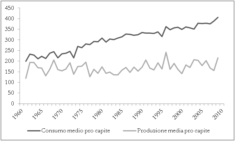 FIG. 2. Consumo medio pro capite e produzione media pro capite in kg per persona di frumento, granturco, orzo e riso. Paesi arabi del Mediterraneo, anni 1961-2010.