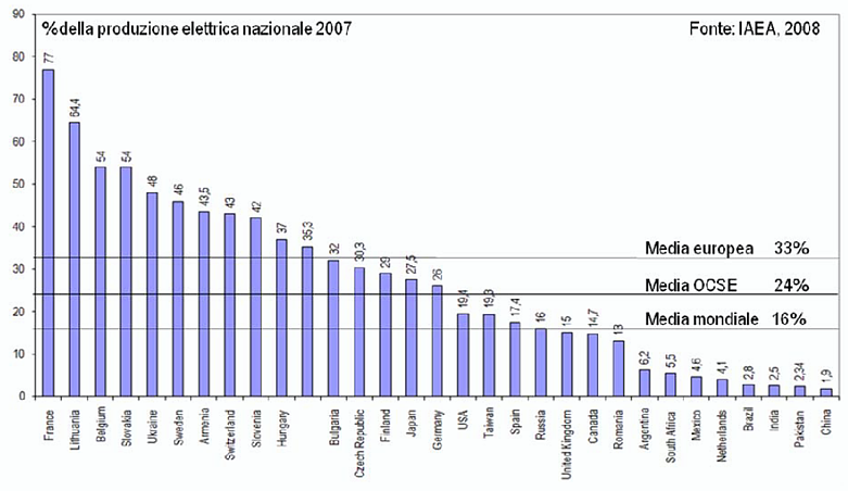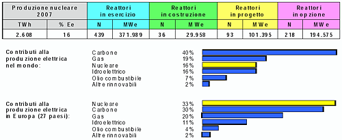 Il contributo nucleare alla produzione elettrica è stato nel 2007 del 33% in Europa (dove il nucleare è la prima fonte di produzione, davanti al carbone), del 24% nei paesi dell’OCSE (l’organizzazione della quale fanno parte i 27 paesi più industrializzati del mondo) e del 16% a livello mondiale.
