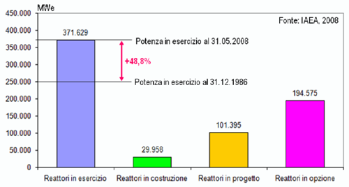 Attualmente (dati IAEA al 30.05.2008) nel mondo ci sono 439 reattori in funzione in 32 paesi, 36 reattori in costruzione in 14 paesi (tra cui 11 in Europa), 93 reattori in progetto in 14 paesi e 218 reattori in opzione in 23 paesi.