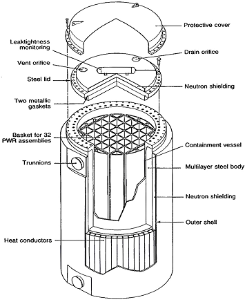 In poche centinaia di anni la radioattività decresce di un fattore oltre centomila, dopo di che le specie più attive sono l'americio e, successivamente, il tecnezio, emettitore b di 210.000 anni di vita media, e il nettunio, emettitore g di due milioni di anni di vita media. Il deposito temporaneo, in linea di principio, può essere "a secco" (circolazione di aria di raffreddamento forzata o naturale) o a "umido" (piscine d'acqua). Lo STOCCAGGIO a secco, per ora meno diffuso, non dà luogo alla produzione di rifiuti radioattivi (prodotti, invece, nei depositi "ad umido"). Si tratta di un tipo di deposito praticamente "passivo" che non richiede, cioè, interventi nel tempo (figura - Contenitore in acciaio per elementi di combustibile (PWR) esauriti e conservati a secco in ambiente di He a pressione sub-atmosferica - CASTOR, GNB)