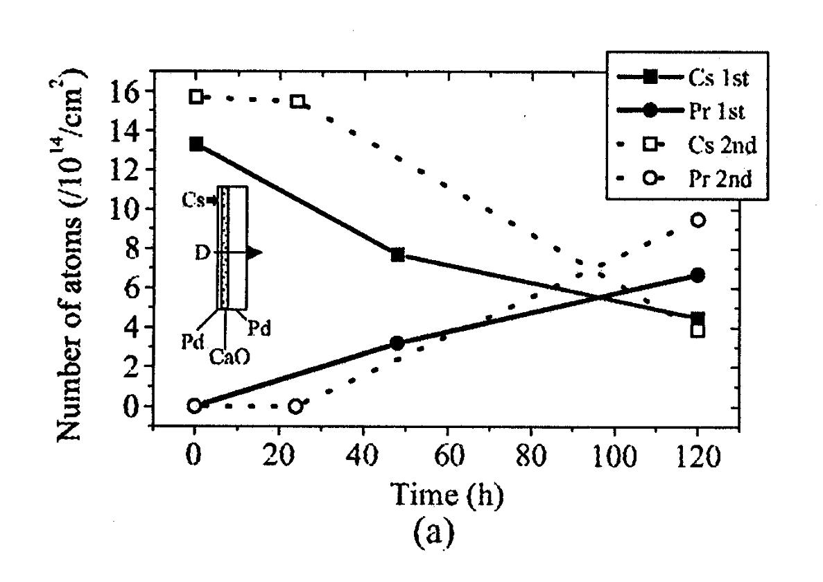 Accanto agli esperimenti "alla F&P" , ne esistono di molti altri tipi. Ritengo che meritino di essere citati quelli che vanno sotto il nome di "trasmutazioni". Da parecchi anni vengono presentati esperimenti nei quali un confronto tra i nuclei presenti in un campione prima che interagisca con un isotopo dell’idrogeno e quelli che si trovano dopo l’interazione mostrerebbe un’evidenza di trasformazioni nucleari: ad esempio, l’apparizione di nuclei che prima erano assenti, oppure la modifica del rapporto isotopico di un tipo di nucleo. Nel passato c’è stato parecchio scetticismo su questi risultati, anche nel mondo della FF. Ma recentemente le evidenze sperimentali sono diventate sempre più convincenti. Qui di seguito riporterò un dato della ricerca di un gruppo giapponese, guidato dal Dr. Iwamura, descritta in un articolo apparso di recente, che ho apprezzato per la cura nello svolgimento delle misure e nella presentazione dei risultati. Citerò solo un tipo di esperimento, che ha anche la virtù di essere stato ripetuto più volte con lo stesso esito. In esso deuterio in forma gassosa attraversa un campione costituito da una successione di strati di CaO e Pd, a cui viene aggiunto un sottile strato di cesio. La composizione alla superficie di questo strato viene analizzata in funzione del tempo, durante l’ESPOSIZIONE al flusso di D2, mediante XPS (X-ray Photoelectron Spectroscopy).