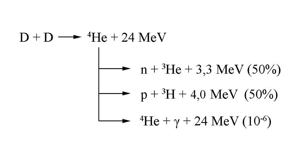 Di solito, il nucleo di elio non sopravvive, proprio a causa della eccessiva energia, e si spacca prevalentemente in uno di due modi diversi: in un caso produce un neutrone (n), cioè una particella senza carica, e un nucleo di 3He (elio di massa 3), nell’altro un protone (p), cioè un nucleo di idrogeno, e un nucleo di trizio, (3H). Le due soluzioni hanno circa la stessa probabilità, e le particelle sunnominate portano con sé quell’energia che si vuole poi utilizzare in pratica.