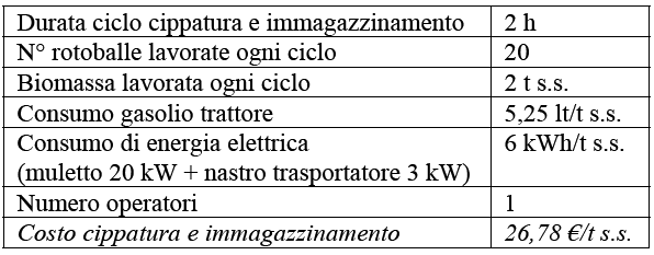 Le elevate dimensioni delle rotoballe (1,0 m di diametro x 1,1 m di altezza), se da un lato consentono una facile raccolta in testa ai filari, non sono però compatibili con le dimensioni della bocca di carico delle cippatrici di piccola o media taglia ottimali per questa taglia di impianto; l’impiego di una cippatrice forestale, più adatta alla cippatura di grossi tronchi o rotoballe, non sarebbe stata economicamente sostenibile all’interno del progetto di filiera.
