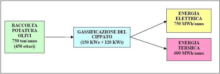 Ad esempio, una superficie dedicata ad oliveti di circa 450 ha, e considerando una produzione di potatura ad ettaro pari a 1,7 t, si ottengono circa 750 t/anno di scarti di potatura con la quale si realizza una resa in termini di energia elettrica netta di circa 750 MWh/anno, oltre ad una quantità di poco inferiore di energia termica (circa 600 MWh/anno).