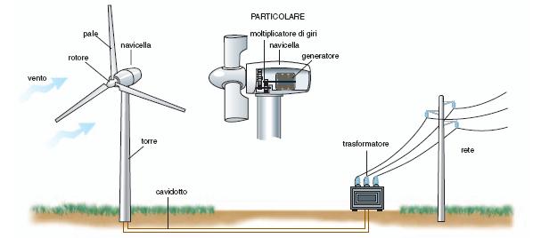 Un impianto eolico è costituito da una o più turbine (aerogeneratori) che trasformano l’energia cinetica del vento in energia elettrica, operando attraverso il semplice principio di seguito illustrato.