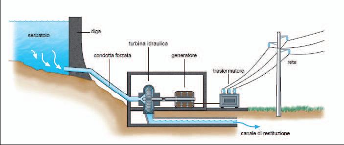 L’acqua viene opportunamente derivata tramite le opere di presa e convogliata nella vasca di carico dalla quale si dipartono i canali e/o le condotte forzate che vanno ad alimentare le turbine idrauliche. L’albero della girante della turbina è collegato ad un generatore di elettricità (alternatore).