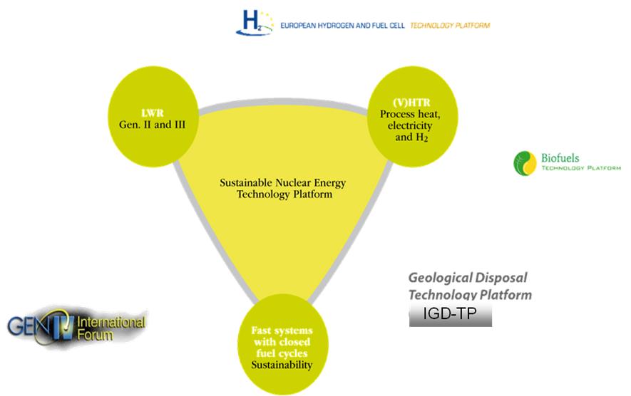 La SNE-TP intende, inoltre, interfacciarsi con altre piattaforme tecnologiche europee, come ad esempio quelle per il deposito geologico dei rifiuti radioattivi (la già menzionata IGD-TP), per l’"idrogeno e celle combustibile" e per i biocombustibili, nonché con le grandi iniziative internazionali sul nucleare del futuro quale GIF (vedi figura).