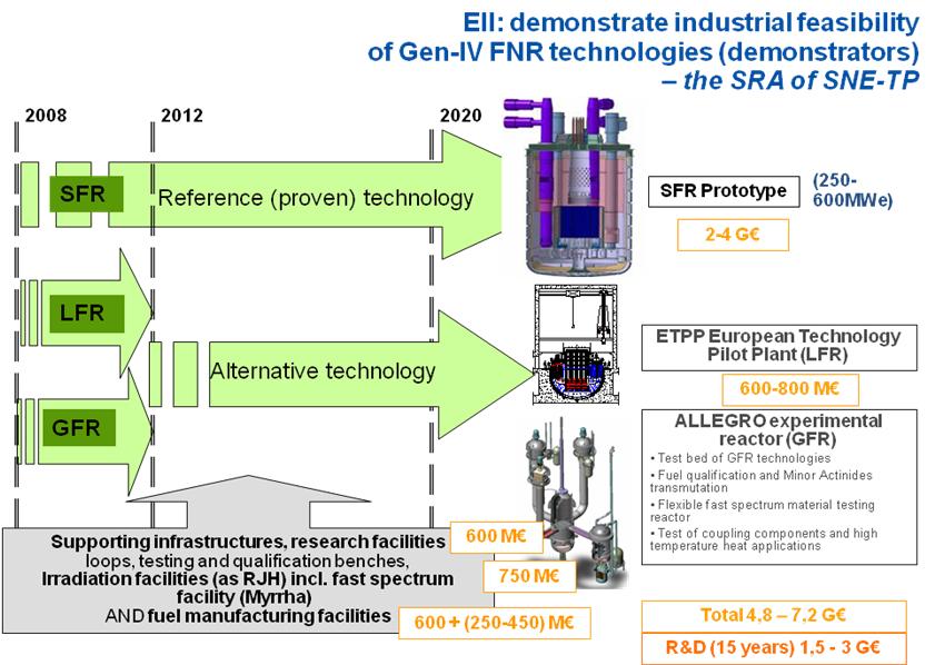 Infine la SNE-TP gestisce la European Industrial Initiative (EII) per il nucleare da fissione inclusa nel SET-Plan, focalizzata sullo sviluppo di tecnologie di IV generazione. Gli elementi fondamentali che costituiscono questa EII sono rappresentati nella figura in seguente, unitamente alla relativa stima complessiva dei costi.