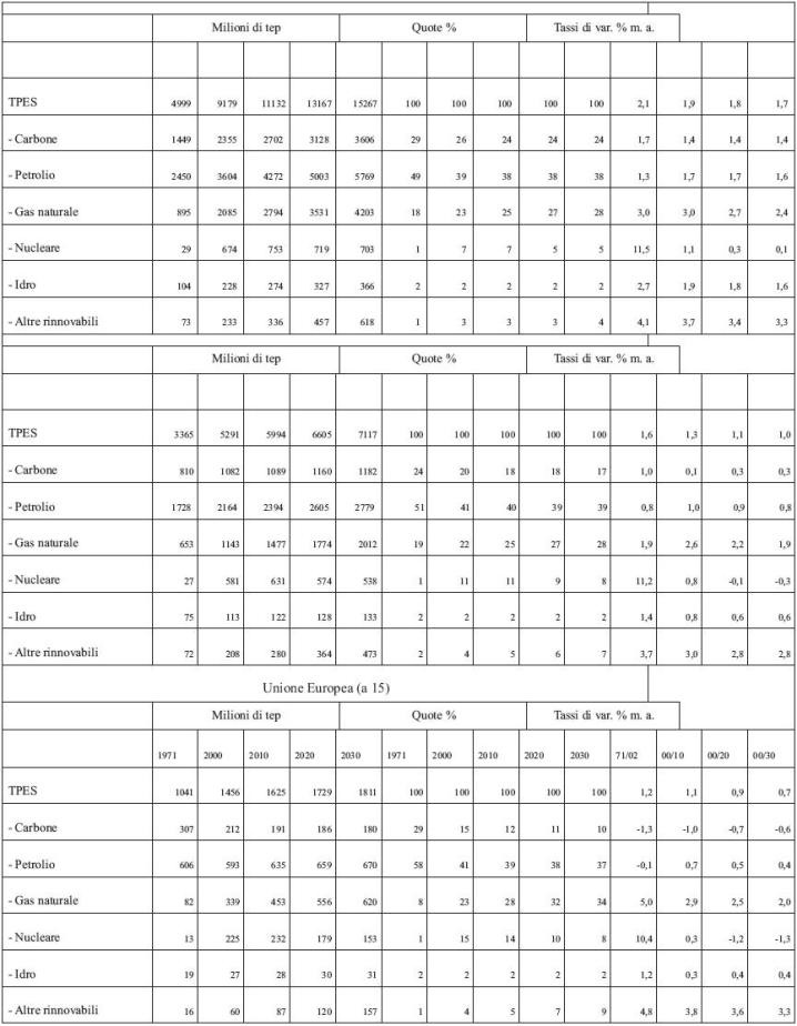 Come può desumersi dalla tabella, il principale elemento caratteristico degli scenari prefigurati è la prospettiva di crescita piuttosto forte della domanda energetica complessiva (TPES) e della domanda di tutte le fonti primarie di energia.
