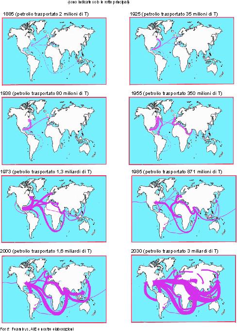 Tale previsione è rappresentata nell'ultimo riquadro delle figure sottostanti, le quali offrono un'immagine approssimata ma eloquente dello sviluppo del trasporto marittimo del greggio attraverso gli anni.