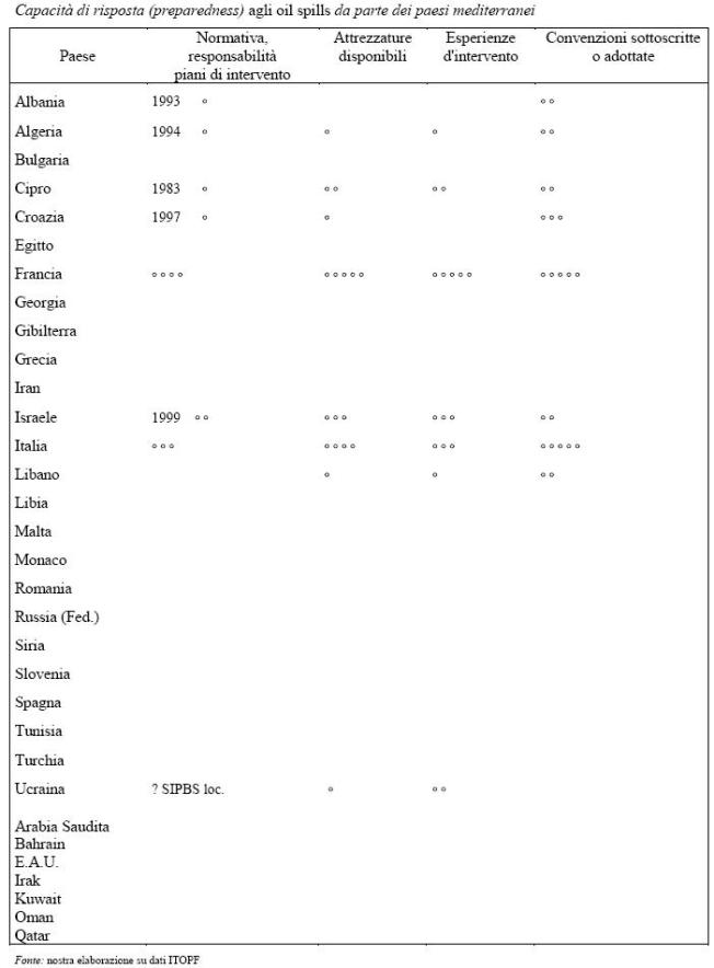 Oltre alla capacità di risposta tecnica nei paesi mediterranei in generale, non può non essere sottaciuto lo stato non del tutto tranquillizzante in cui si presenta in Italia l'organizzazione preposta alla gestione del controllo ordinario delle maree nere e ai piani di intervento.