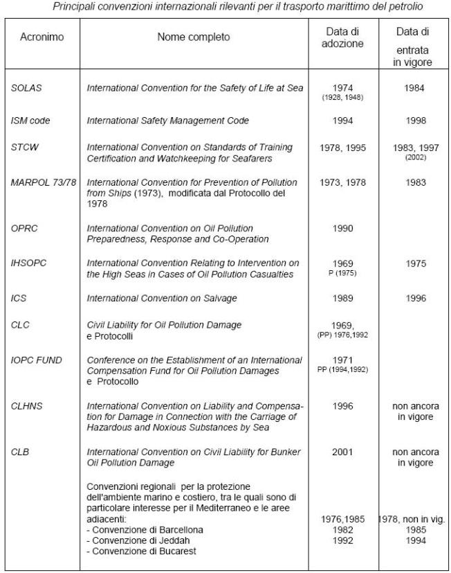 Le convenzioni internazionali hanno modificato nell'ultimo trentennio il quadro normativo della la sicurezza nel trasporto petroliero, influenzandone tutti gli aspetti: dalla progettazione dei tankers, alla dotazione di standard di sicurezza, alle regole di navigazione, all'imposizione di obblighi e controlli, ai comportamenti in situazioni di emergenza, alla definizione della responsabilità e dei meccanismi di indennizzo in caso di incidenti.