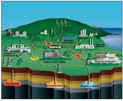 La CO2 coprodotta (linea gialla) viene separata e confinata in giacimenti esauriti di idrocarburi o in acquiferi salini a grande profondità (come si vede in basso).