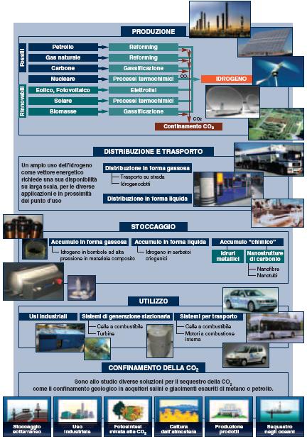 Nella figura seguente è riportato uno schema dei possibili metodi di produzione e di utilizzazione dell’idrogeno.