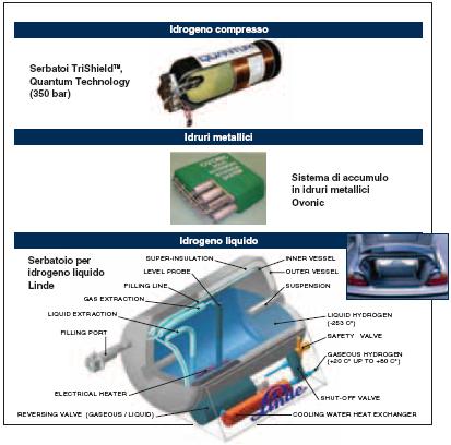 Qui le soluzioni possibili prevedono la COMPRESSIONE del gas, la sua liquefazione e infine l’accumulazione su idruri metallici (vedi figura).