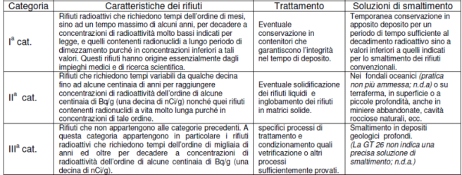 Nella tabella sotto riportata sono indicate le tipologie e le prescrizioni per la gestione dei rifiuti radioattivi secondo la norma italiana di riferimento, ancora oggi costituita dalla Guida Tecnica n.26, predisposta dall’ENEA-Disp nel 1985 come strumento necessario per lo sviluppo del programma nucleare allora in sviluppo.