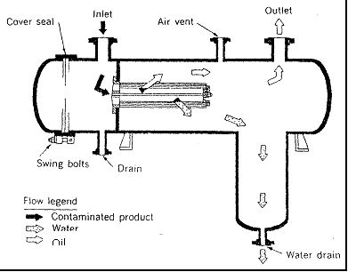 Il metodo più semplice per coalescere la dispersione di un liquido in un altro è quello della decantazione. In molti casi prima o poi si verificherà la coalescenza formando due strati separati per azione della gravità. Questo tipo di separatore consiste semplicemente di una camera vuota abbastanza capiente da contenere il refluo da trattare (Figura 1). L’efficienza di un separatore a gravità dipende dalla geometria idraulica e dal periodo permanenza delle acque in rapporto ad una precisa velocità di risalita. Tempi lunghi di residenza aumentano generalmente l’efficienza di separazione. L’effettiva rimozione di gocce d’olio per una data velocità di risalita è una funzione della geometria della struttura. Il periodo di residenza deve essere tale da permettere che le gocce d’olio con una certa velocità di risalita raggiungano lo strato superficiale del fluido dove potranno essere rimosse da appositi skimmers. Lunghi periodi di residenza sono previsti per flussi elevati con l’utilizzo di vasche molto capienti che possono misurare da 4.5 m. a 6 m. di diametro e da 14 m. 18 m. di altezza. L’acquisto di un separatore a gravità può rappresentare un investimento importante in termini di capitale.