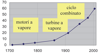 Fig. 3. I progressi nella comprensione dei fenomeni che si verificano nei motori termici e i perfezionamenti delle tecnologie e dei materiali hanno condotto a migliorare il rendimento di queste macchine nel corso di tre secoli: dallo 0,5% del motore di Newcomen all’inizio del Settecento al quasi 60% dei sistemi a CICLO COMBINATO usati oggi nelle centrali termoelettriche. Che cosa significa migliorare il rendimento delle centrali? Significa, a parità di energia elettrica prodotta, ridurre il consumo di combustibile con il vantaggio ulteriore di ridurre l’INQUINAMENTO ambientale e le emissioni di CO2.