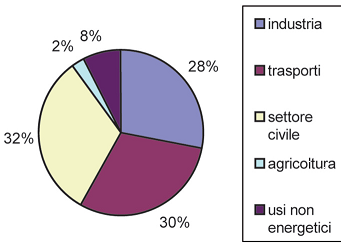 L’energia consumata in Italia nell’anno 2005 ammonta complessivamente a 198milioni di tonnellate equivalenti di petrolio, pari a 8,3 EJ (1 EJ = 1018 J). A questo fabbisogno contribuiscono in modo predominante i combustibili fossili. La Fig. 4 rappresenta i consumi di energia per settore d’impiego.