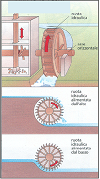 Le prime ruote idrauliche di mulini erano orizzontali, ma le loro origini restano incerte: la ruota mossa dalla CORRENTE dell’acqua faceva ruotare un albero che era direttamente accorpato alla macina; questo modello semplice era adatto alle macine di piccola scala.