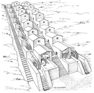 Figura 8: rovine e illustrazione del mulino di Barbegal, in Provenza (II secolo d.C.)