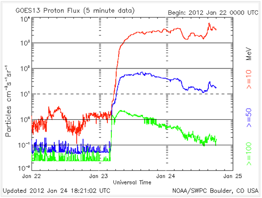 L’abbiamo scampata. Il 23/1/2012 satelliti e stazioni a terra segnalarono in arrivo dal sole una tempesta di protoni: quelli con alta energia sono passati da 10 a 7500 per cm2 e per secondo [vedi diagramma]. Poi il flusso di protoni si è affievolito. Se fosse cresciuto molto, avremmo avuto disastri. Anche in Italia il cielo notturno si sarebbe colorato di verde, viola e rosso: aurore boreali che si vedono vicino ai poli. Poi sarebbe diventato rosso sangue. Grossi blackout ci avrebbero tolto l’elettricità. Le linee telefoniche e telegrafiche fuori uso avrebbero impedito gli interventi di emergenza. Ferrovie, gasdotti e oleodotti avrebbero subito danni gravi. Il blocco di reti e tecnologia nelle società più avanzate, prive di energia, potrebbe causare vittime a milioni.