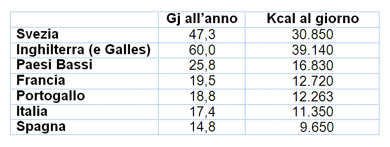 Tabella 1. Consumo pro capite di energia in sei paesi europei nel 1800