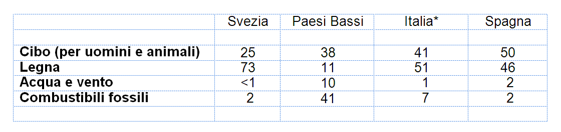 Tabella 2. Composizione del consumo di energia nel 1850 in Svezia, Paesi Bassi, Italia* e Spagna (%).