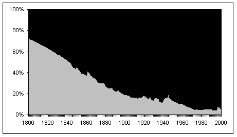 Figura 1. Il consumo di fonti moderne e di fonti tradizionali di energia in Europa occidentale dal 1800 al 2000 (in nero l’area delle fonti moderne).