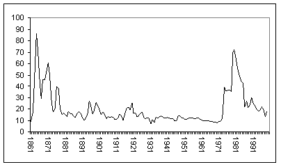 1920-1940: dopo la caduta durante la Prima Guerra Mondiale si ha una ripresa, ma nel corso della crisi economica degli anni ’30 si ha una nuova ridu-zione, seguita da una caduta negli anni della Seconda Guerra Mondiale. Nel complesso, in questo periodo, si ha stabilità;