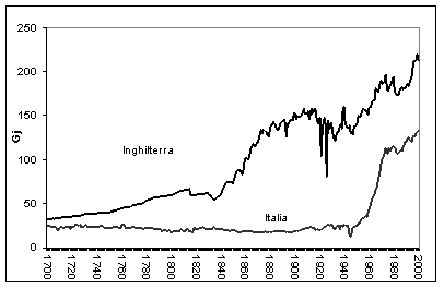 Figura 4. Consumo pro capite di energia in Inghilterra e in Italia dal 1700 al 2000 (in Gj).