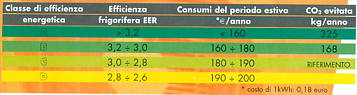 Nella tabella, riportiamo per classe di EFFICIENZA ENERGETICA i consumi di energia elettrica di un condizionatore split da circa 6 kW, capace di raffreddare 2 o 3 stanze per un totale di 40 m2, utilizzato per 8 ore al giorno nei tre mesi estivi.
